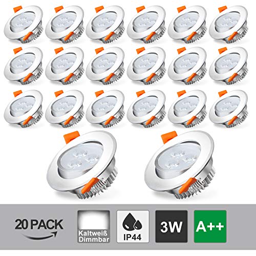 Hengda 20er Set 3W schwenkbare LED Einbaustrahler 230V IP44 Badleuchten 6500K 245lm Weiß Einbauleuchten LED Spots für Schlafzimmer Küche Büro
